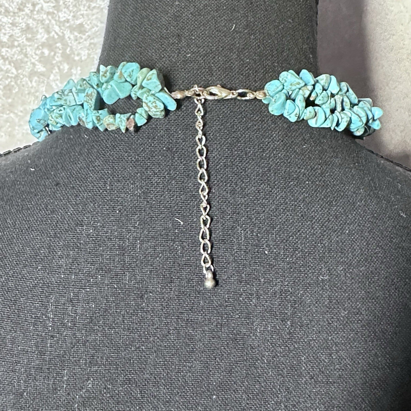 This necklace features three strands of turquoise-dyed stones arranged in a Southwest style, centered with a Christian cross pendant. Its vibrant colors and meaningful design make it a stylish and symbolic accessory for everyday wear.