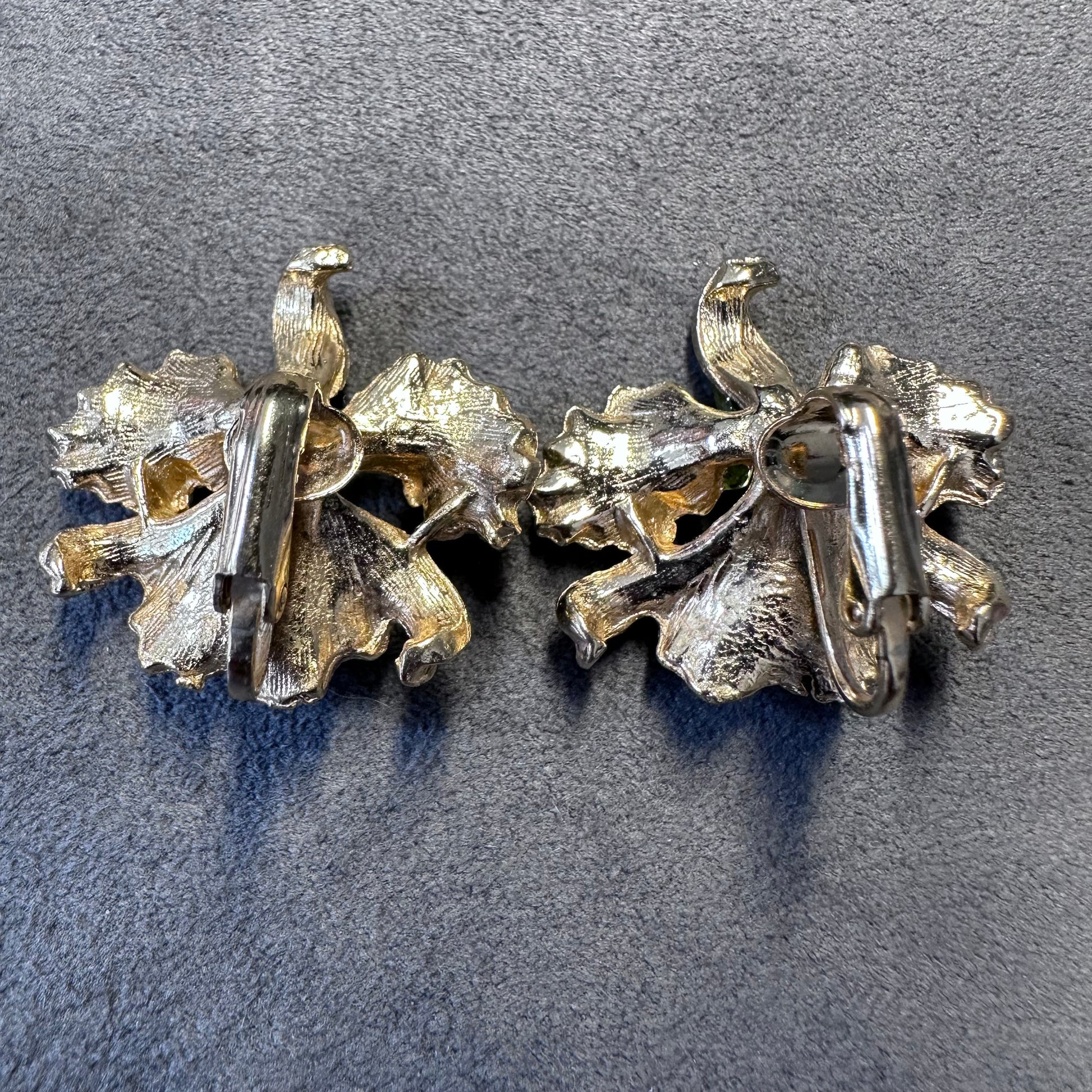 These vintage gold-tone clip-on earrings feature delicate orchid flowers accented with vibrant green stones, adding a touch of timeless elegance to any outfit. Comfortable and easy to wear, they are perfect for those without pierced ears.