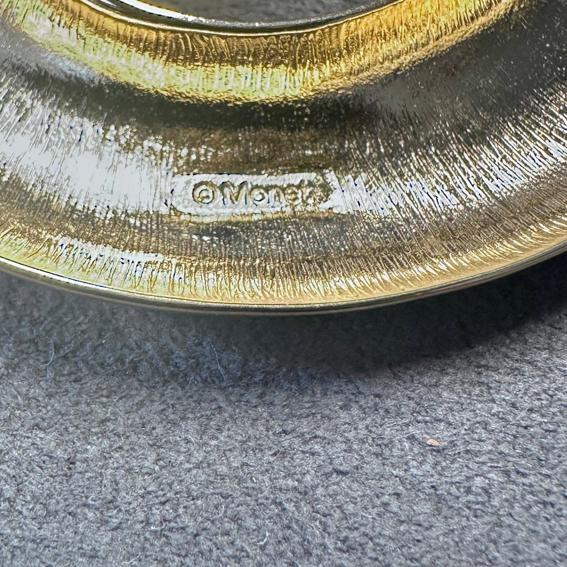 This vintage Monet brooch features a large, elegant gold-tone swirl design. Its timeless style adds a classic touch to any outfit, perfect for special occasions or everyday wear. Lightweight and easy to pin, it’s a versatile accessory that complements various looks.