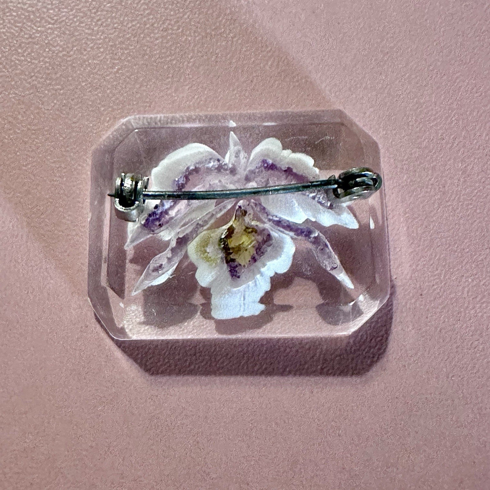 Vintage Lucite Orchid Brooch – Real Flower, Rectangle Design