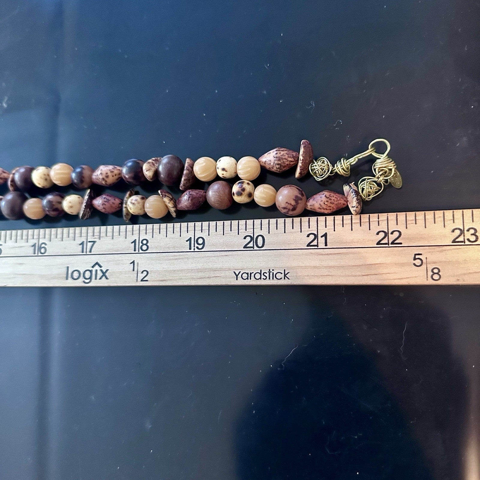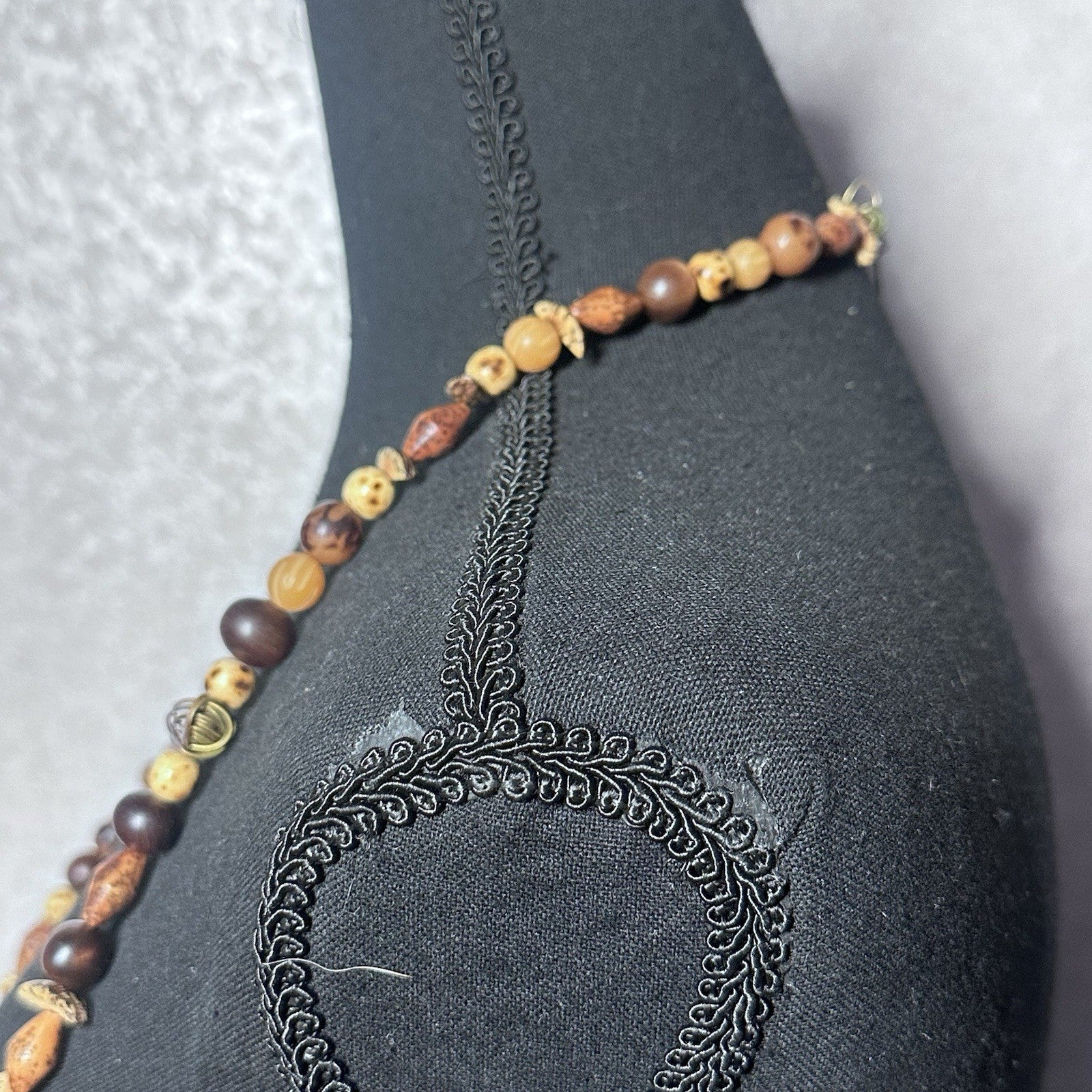 This charming vintage Dayne Duvall necklace combines natural wood elements with colorful mixed stones for effortless layering style. The long design offers versatile wearing options, perfect for adding a touch of artisanal character to your favorite outfits.