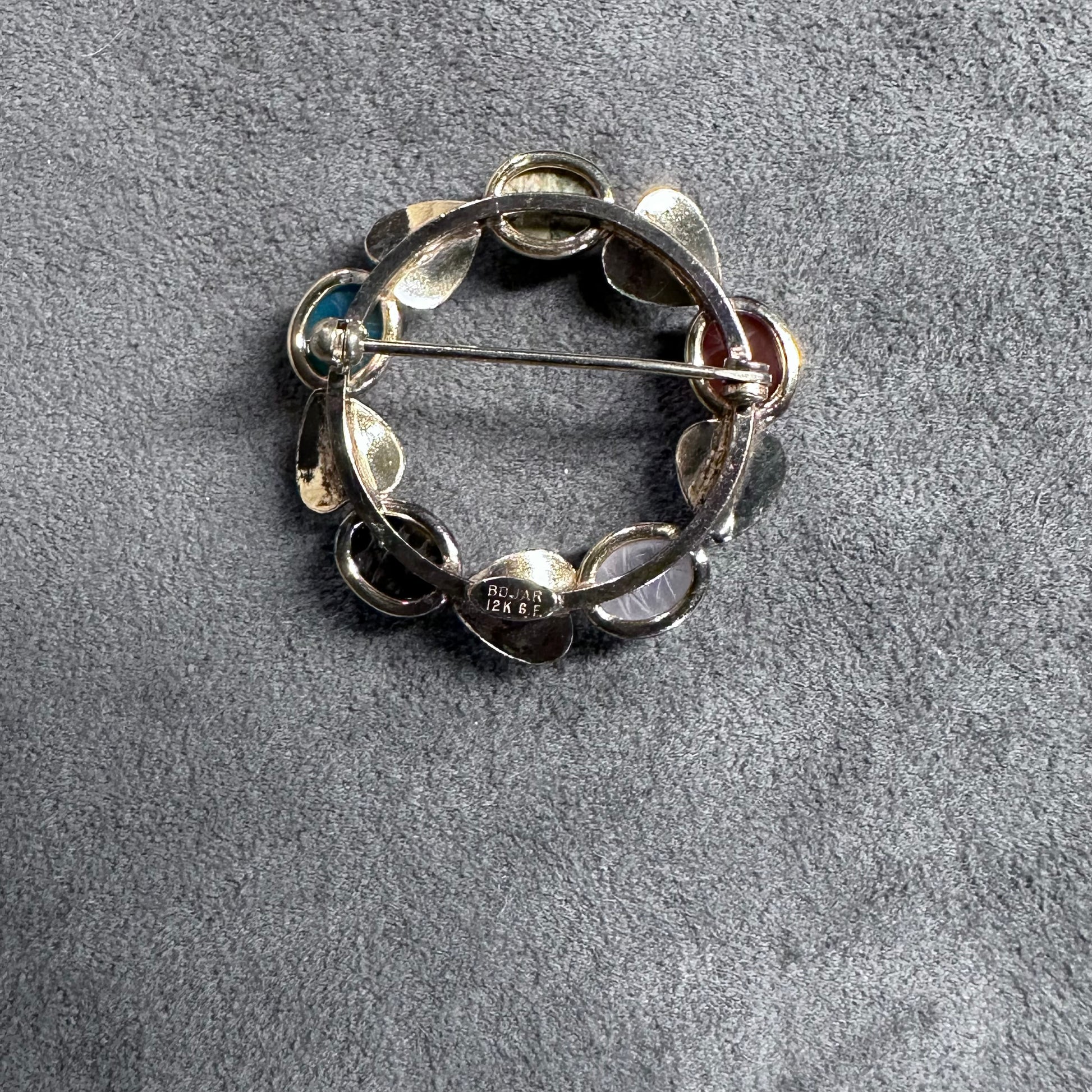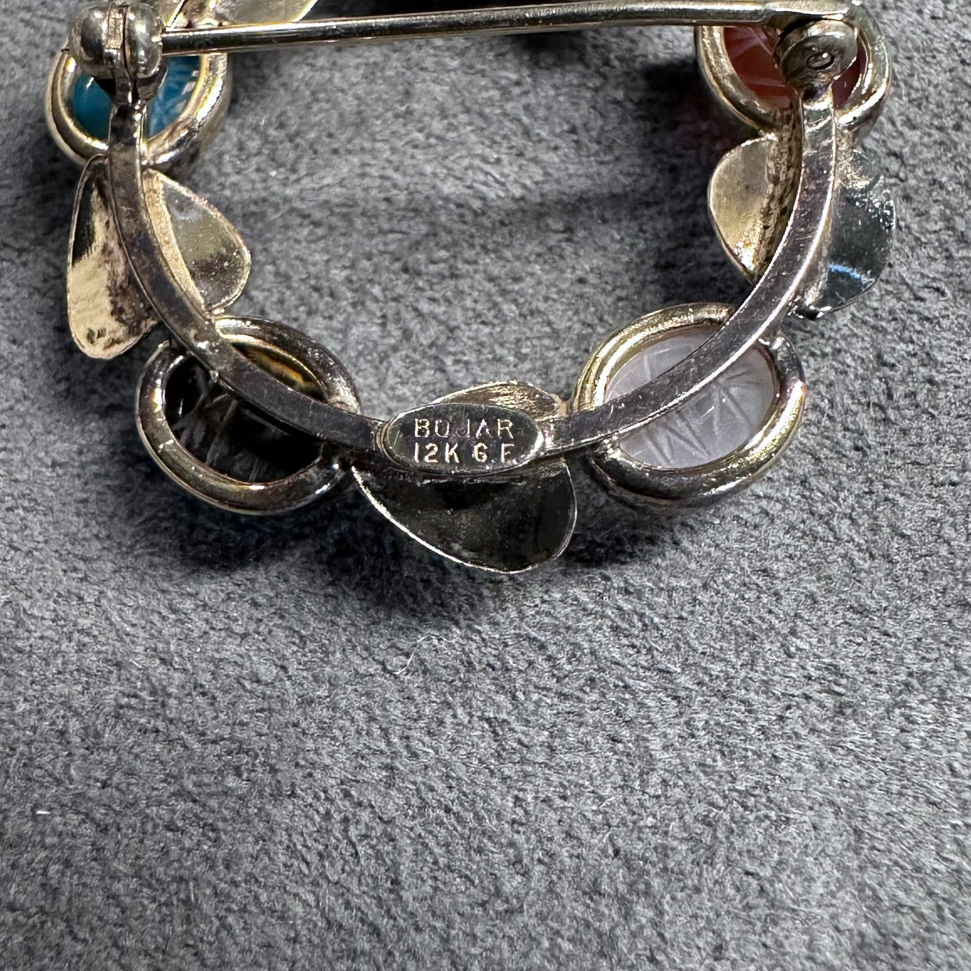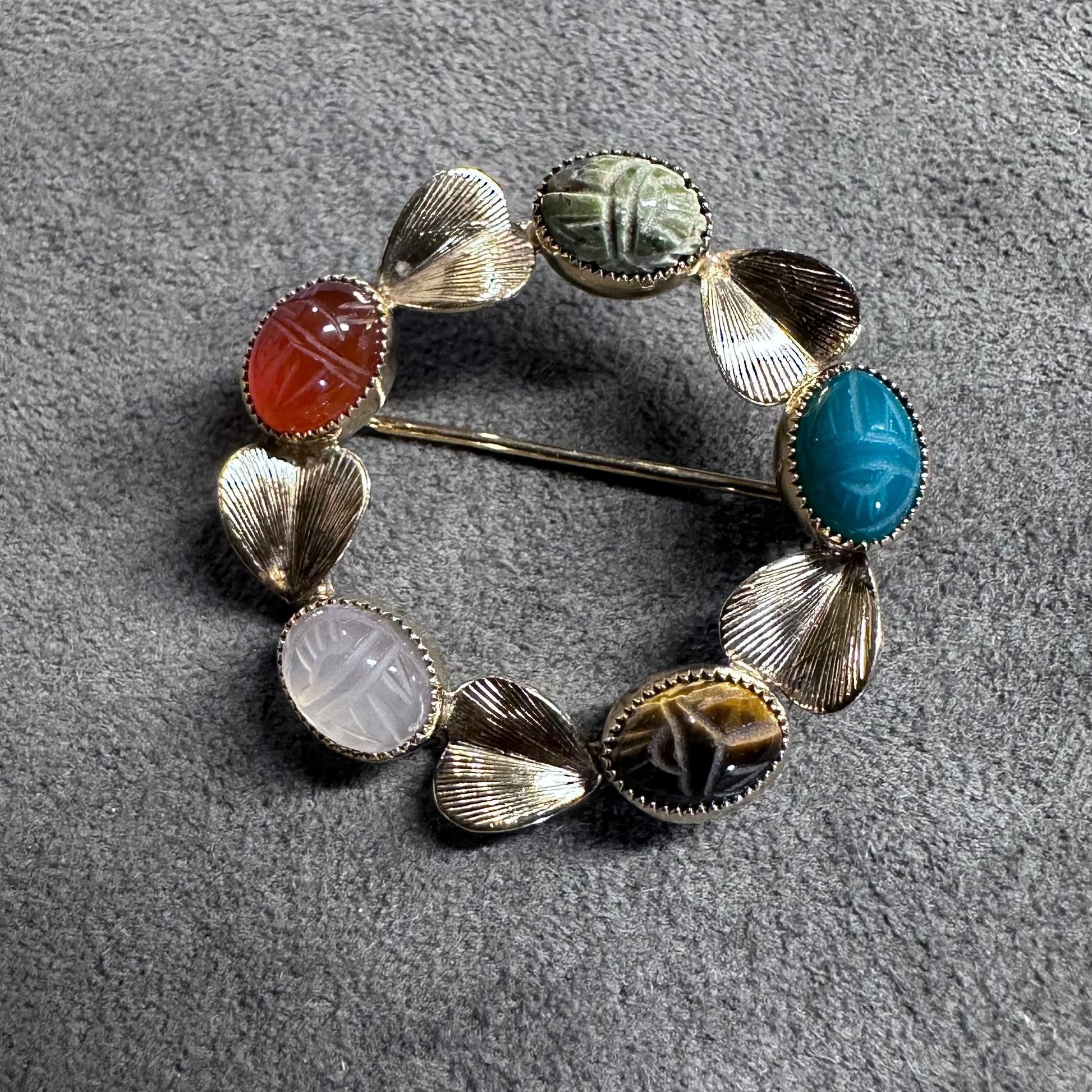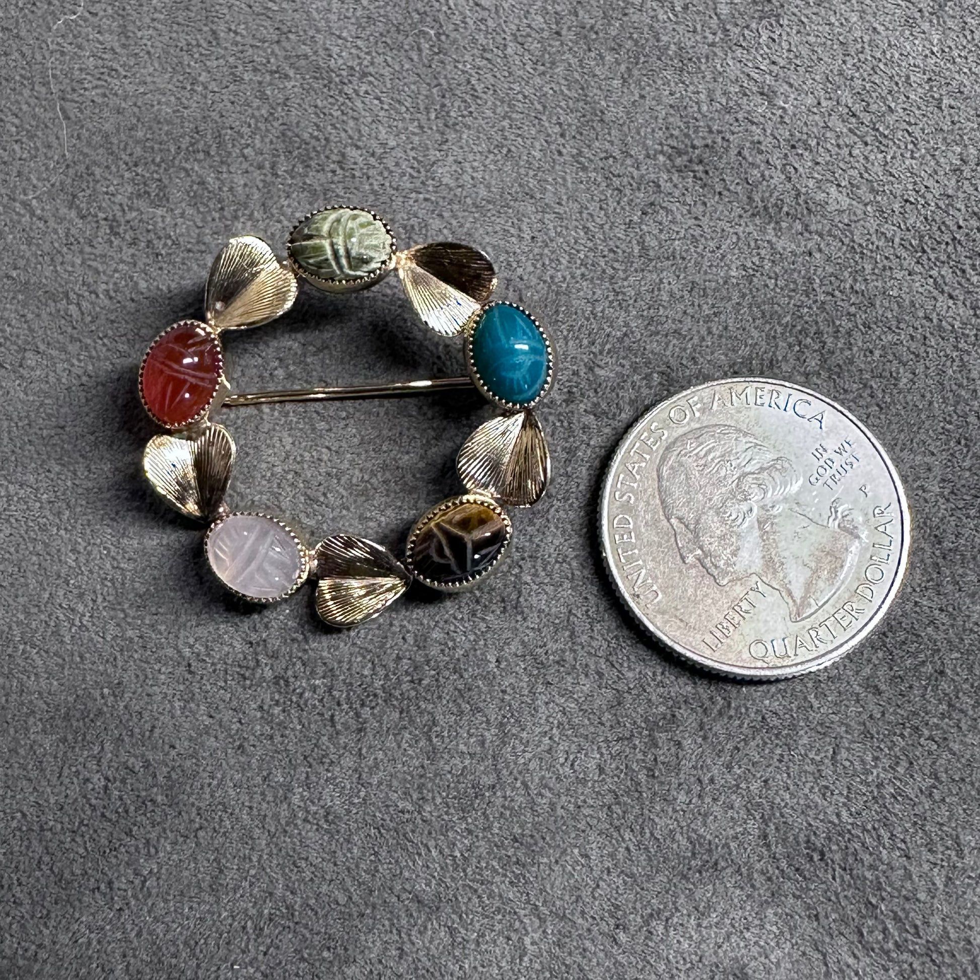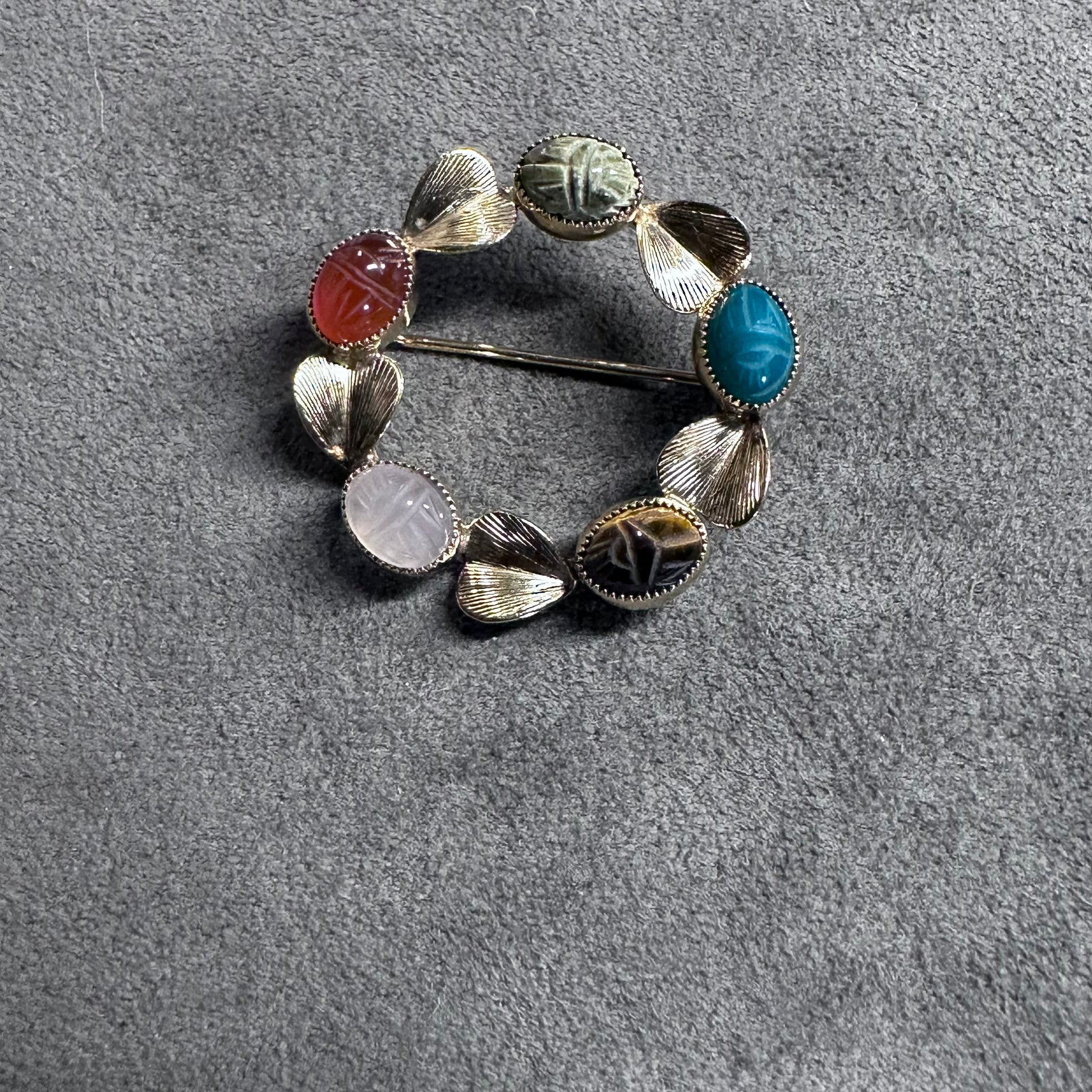 Vintage KL 12k Gold filled Green Black Onyx Carnelian Scarab Wreath Leaf Brooch