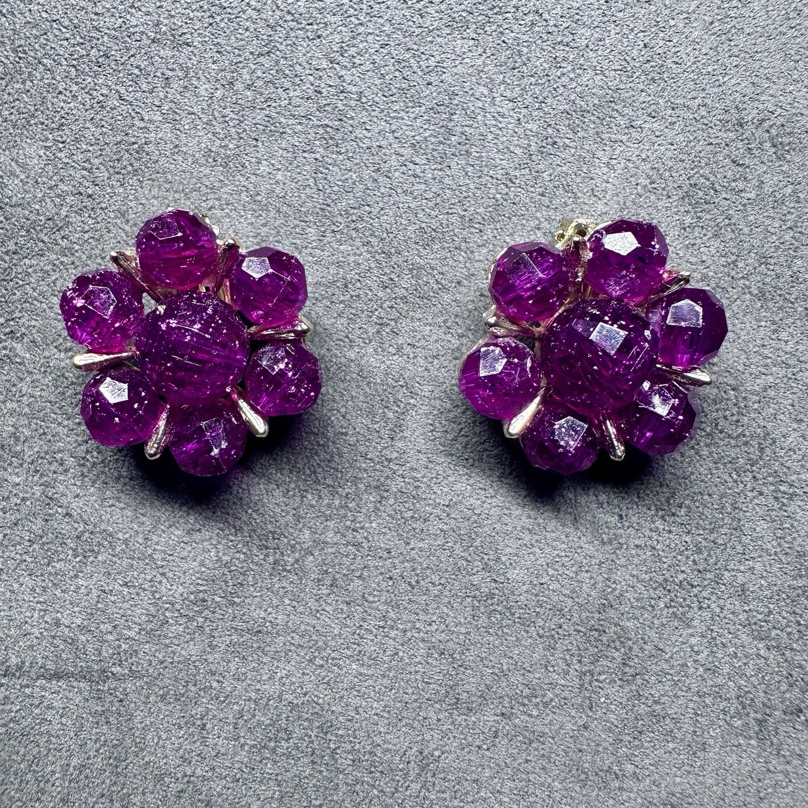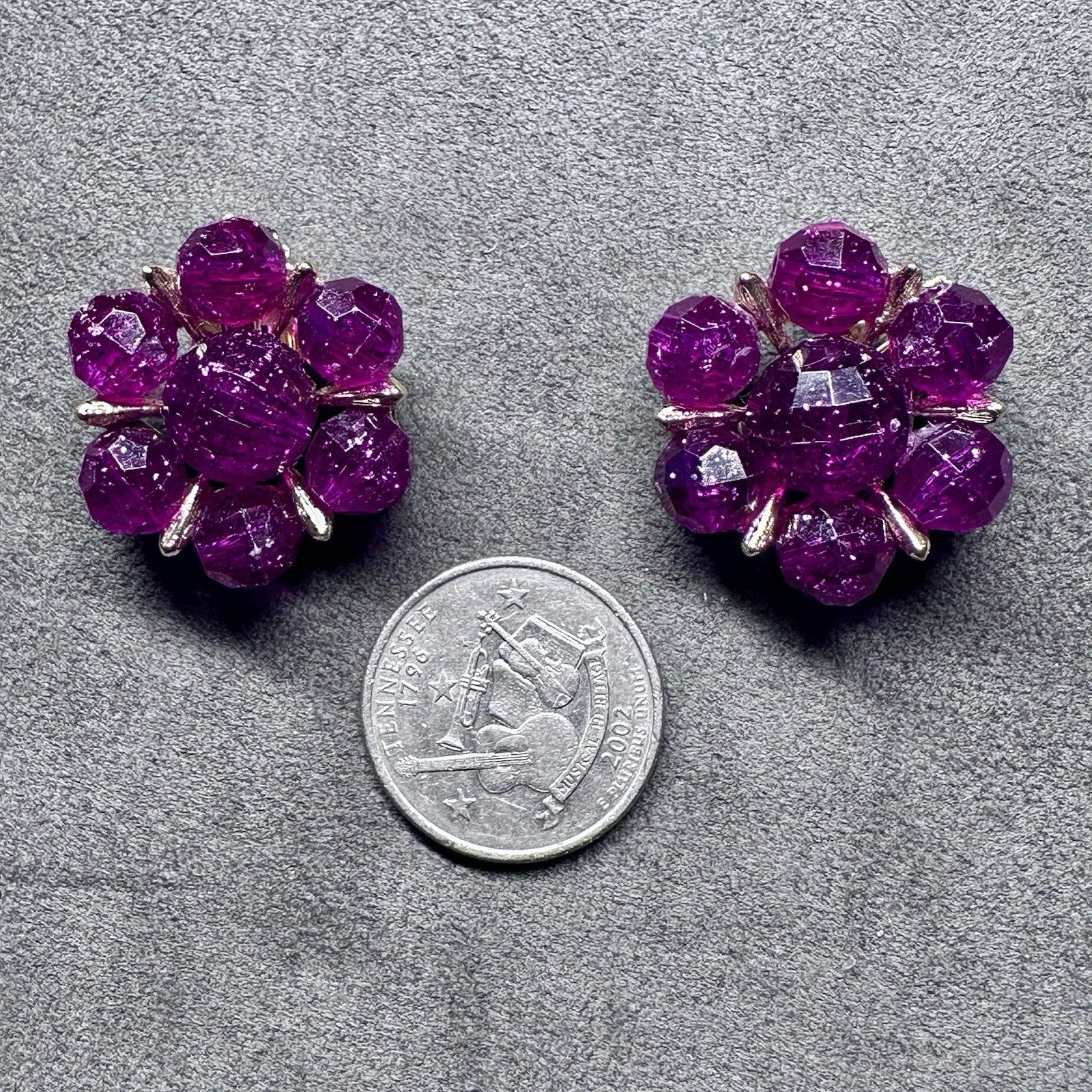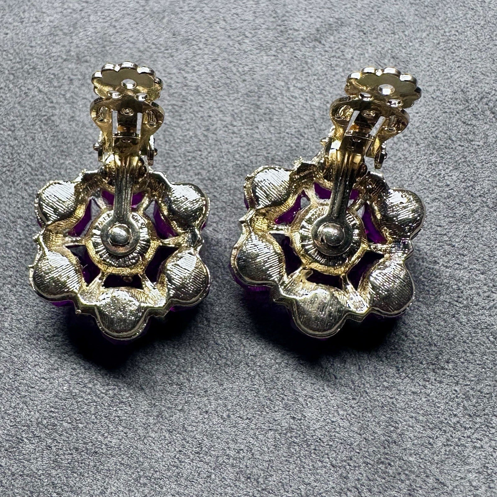 These vintage clip-on earrings feature a charming cluster of purple beads arranged in a floral design, set in a gold-tone finish. Comfortable and easy to wear, they add a touch of classic elegance to any outfit.