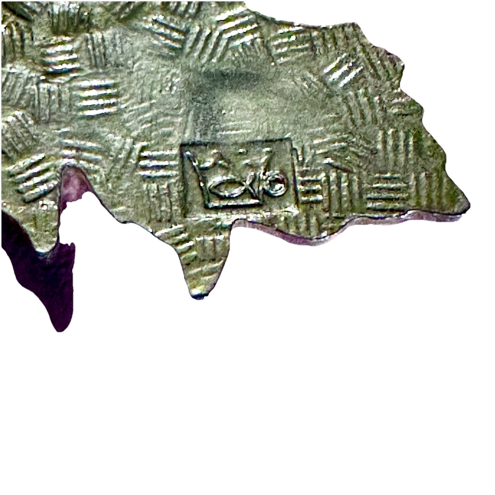 This charming Vintage Stamped Fish and Crown Cloisonne Gold Tone Leaf Brooch is a wonderful addition to your collection. The intricate cloisonne work showcases beautiful craftsmanship with its distinctive fish and crown stamping. The gold tone setting enhances the leaf design, creating a piece that's both unique and versatile. You'll love how this special brooch adds character to jackets, sweaters, or even a handbag, bringing a touch of vintage elegance to your everyday style.