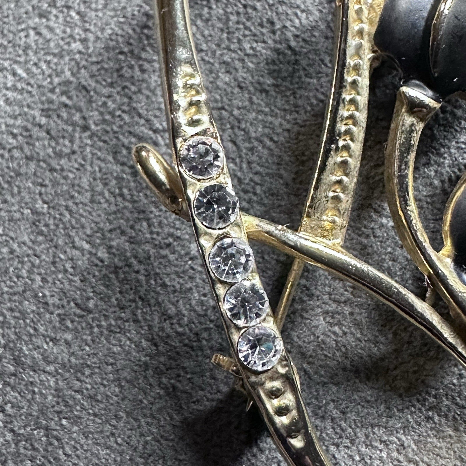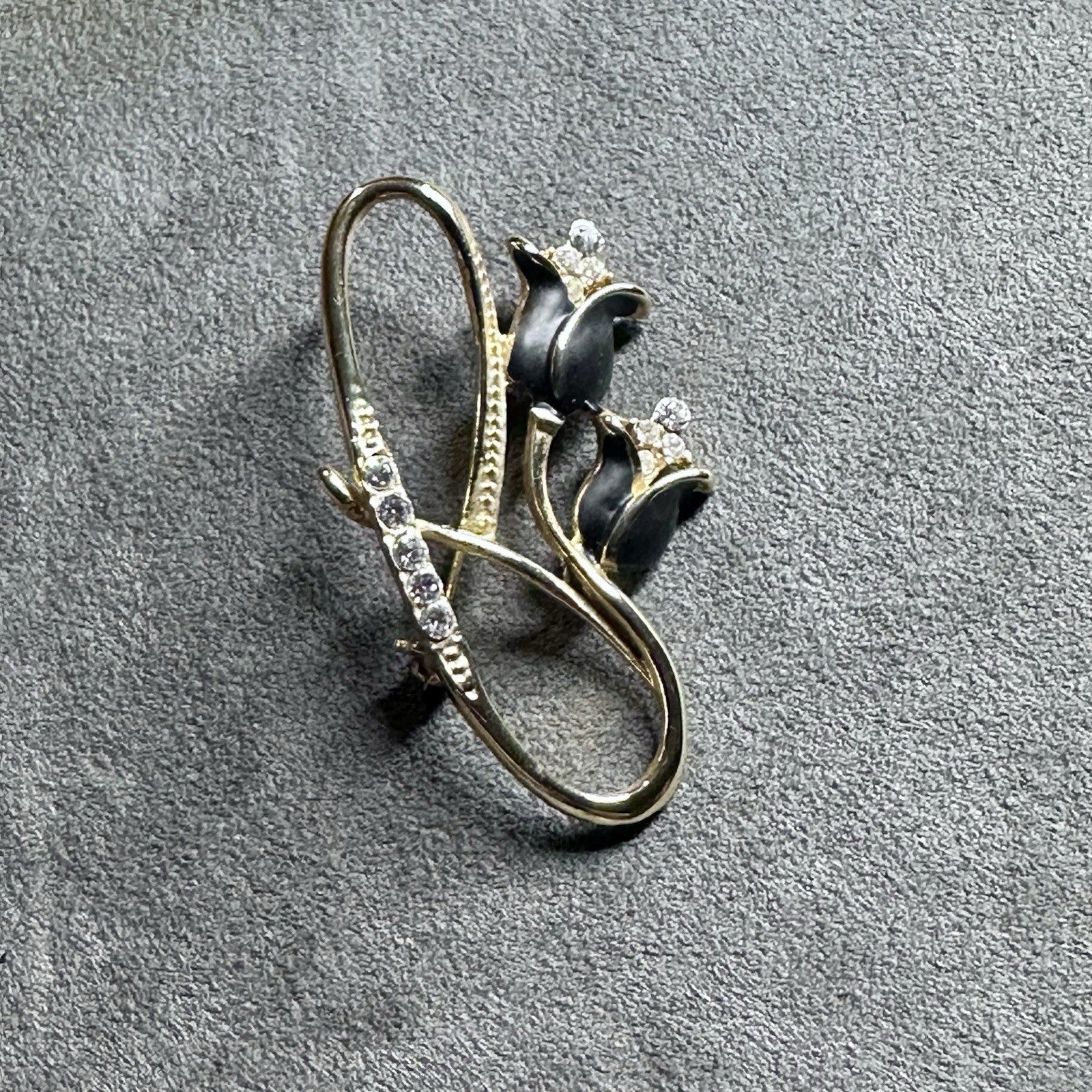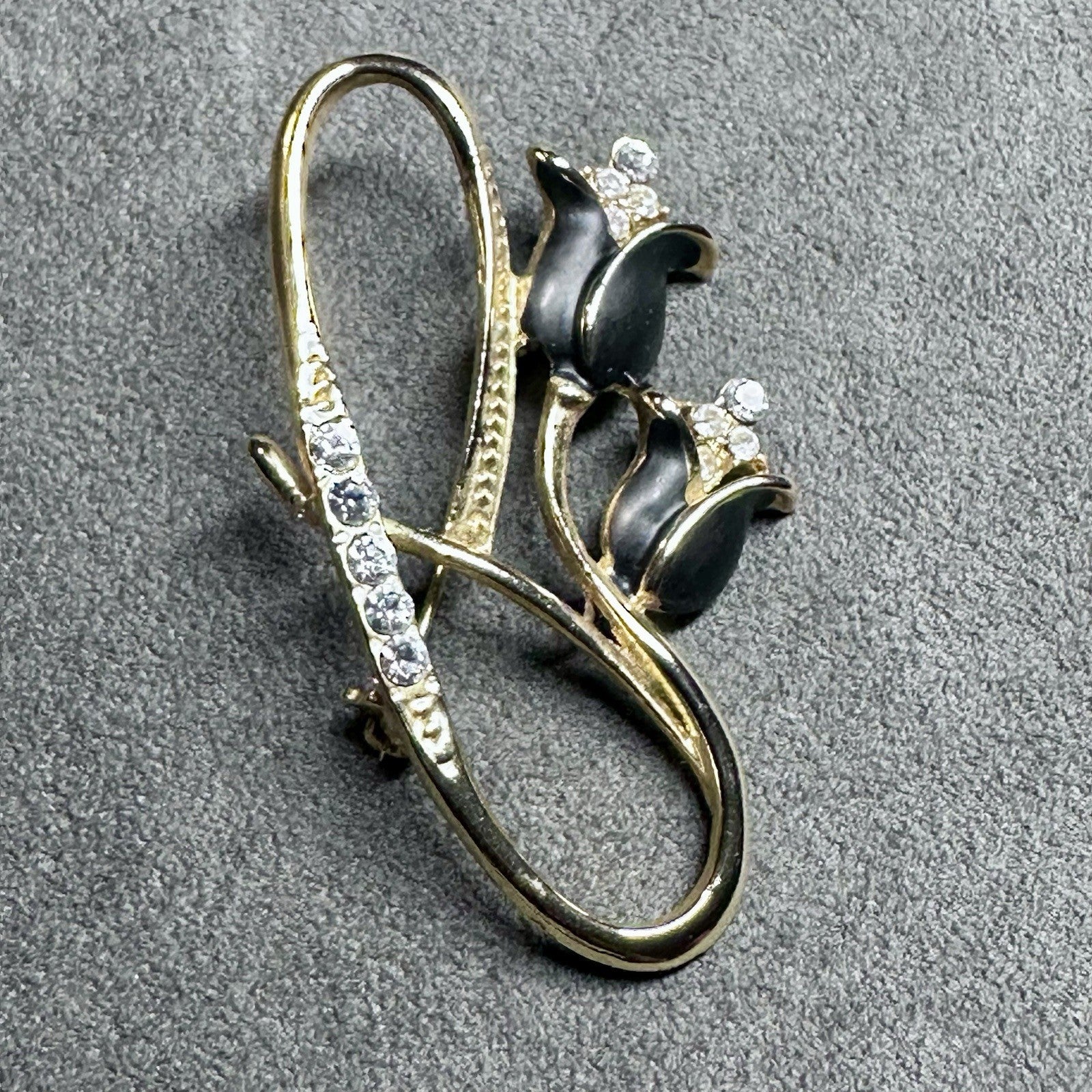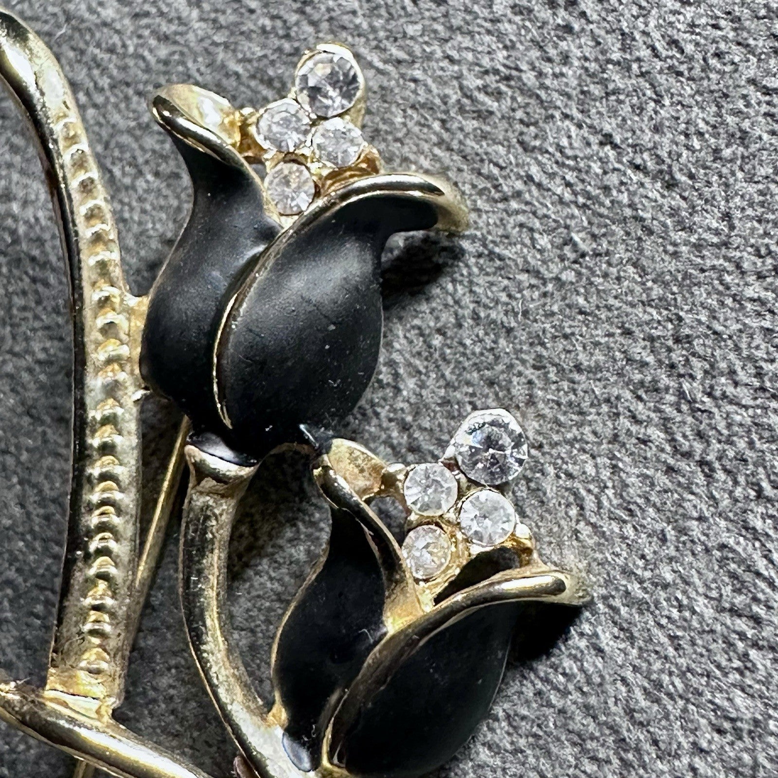 Tulip brooch featuring a striking gold and black design adorned with sparkling rhinestones. Perfect for adding a touch of timeless glamour to jackets, scarves, or hats. A beautiful statement piece that captures classic sophistication.